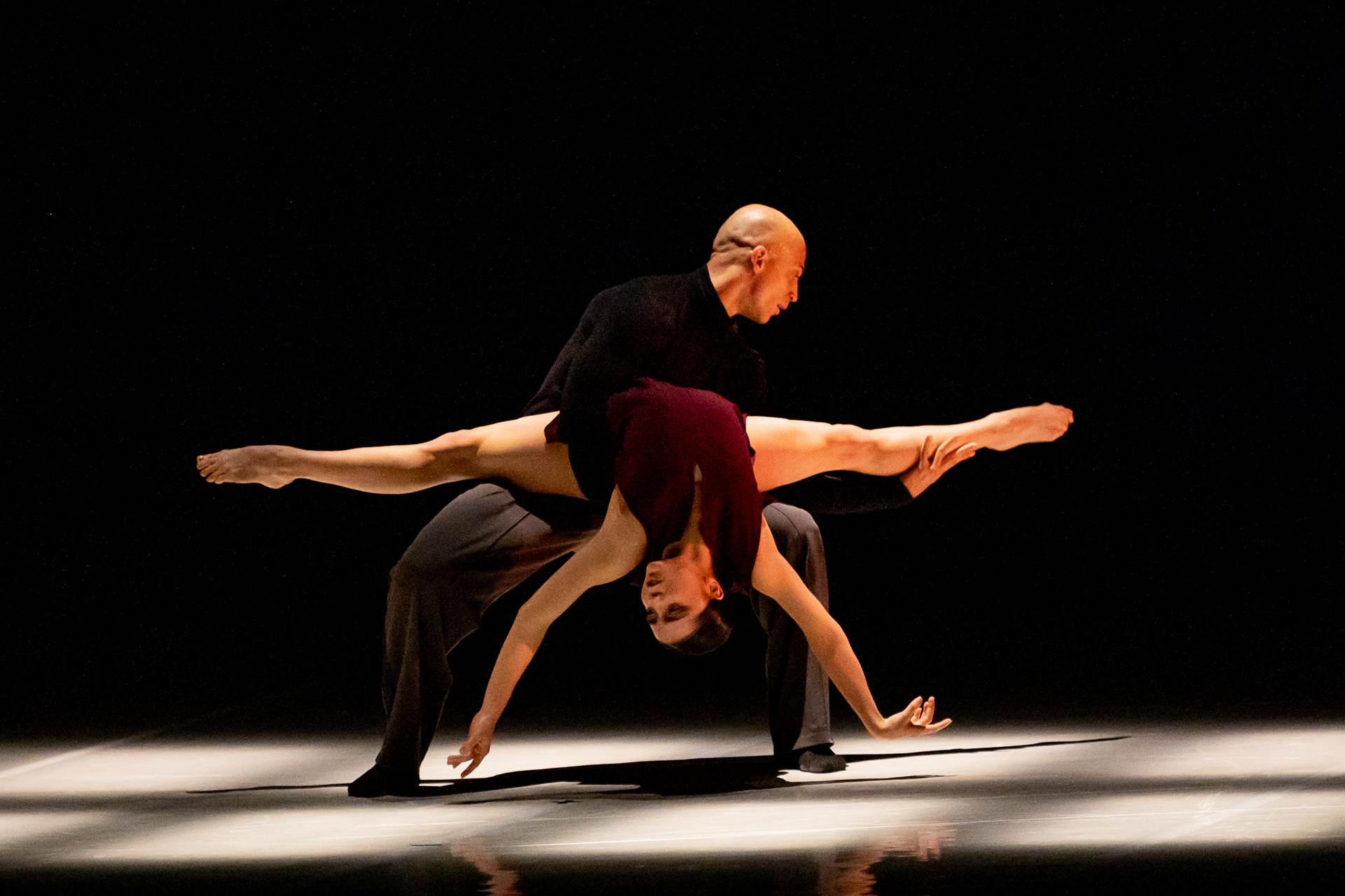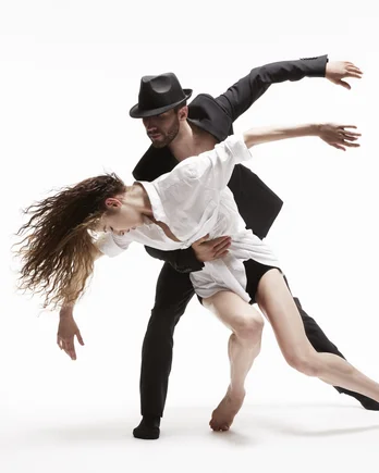 Ein Paar tanzt eindrucksvoll, mit einem Mann im Anzug und einer Frau im weißen Hemd. Sie posieren dynamisch.