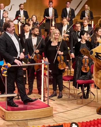 Ein Orchester mit einem Dirigenten auf der Bühne, daneben ein großes Maskottchen in Form einer Maus. Publikum applaudiert.
