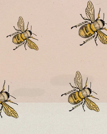 Vier gezeichnete Bienen schweben vor einem zweifarbigen, hellen Hintergrund. Ihre Körper sind detailliert illustriert mit gelben und schwarzen Streifen.